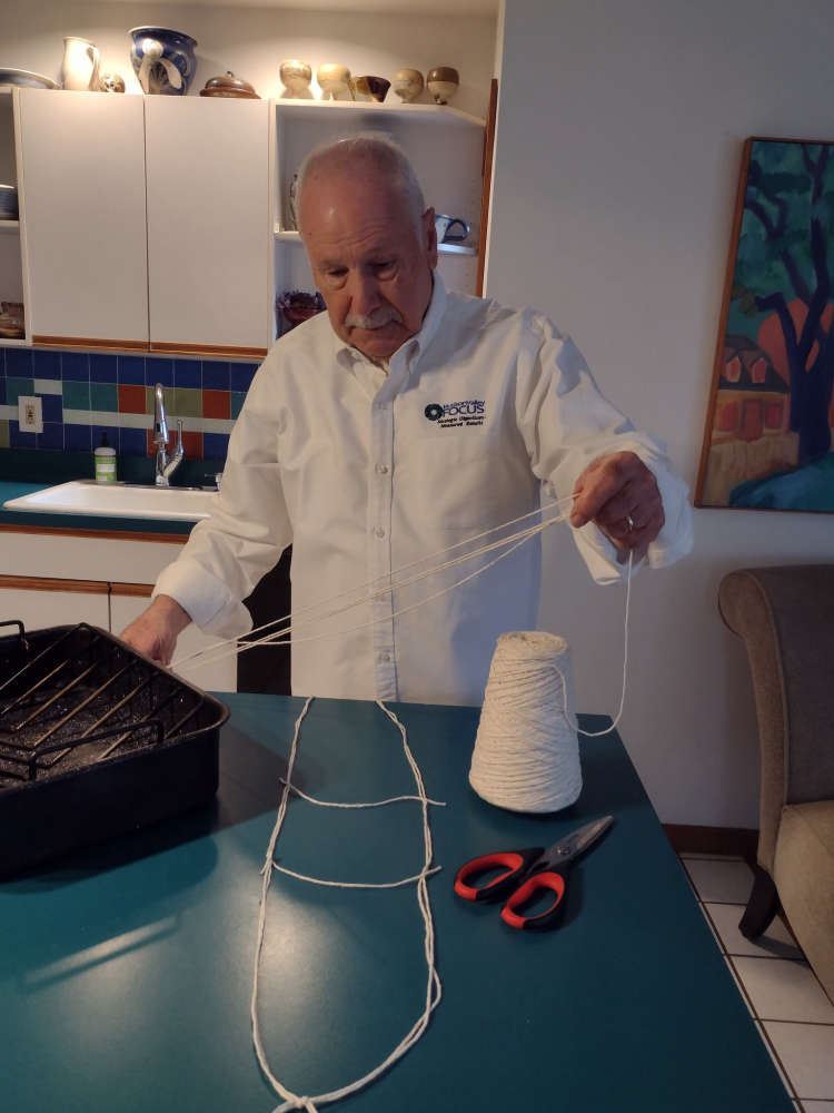 Making the string cradle. Use heavy cotton butcher's string. Cut between 8 and 10 feet of string, tie the ends together and fold into a double loop. If it's a bigger stuffed turkey make two cradles to support the weight. Tie two or three cross pieces, as shown, so the cradle can not split apart and have the turkey fall through.