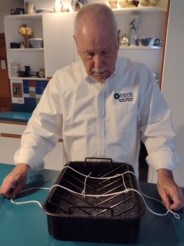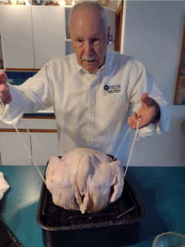 Lift and test the balance. Adjust if necessary. NOTE there is a large portion of the sting cradle to one side. Keep it offset that way because when the turkey is browned on the bottom side you are going to remove it from the oven, place it on a solid surface, then carefully lift and left it roll over to expose the breast side.