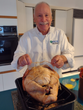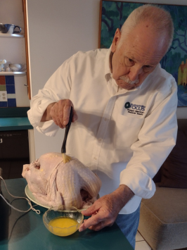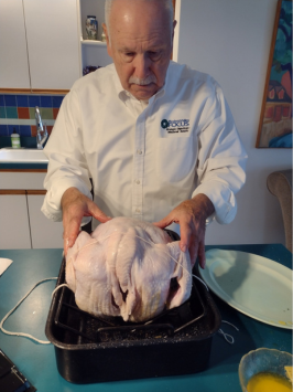 It's an hour and a half later, the turkey is out of the oven and ready to turn breast side up and then ease it back into the V-rack.