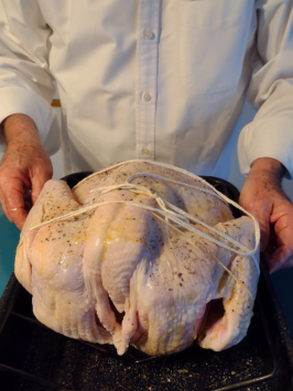 Easing it back into the rack with the breast side now up. Gently adjust the cradle strings, before returning it to the oven to finish roasting, for easy lifting once finished. Be careful not to tear the skin and let the juices flow out.