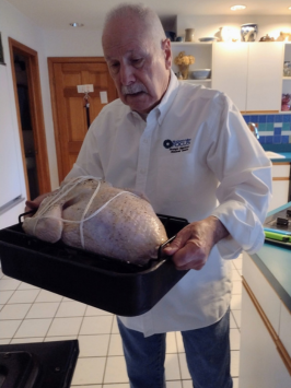 Just in time for Thanksgiving, a new photo series and explanations for Tom's Turkey Roasting Technique. BEFORE you start, be sure to remove the neck and giblets if they are in the turkey. Then rinse thoroughly, inside and out, in cold water and pat dry to the extent possible. Roasting the turkey with the breast side down, for the first half of the time, allows the moisture from the dark meat to keep the breast meat from drying out. Be careful when lifting the bird to turn it, that you don't tear the skin.