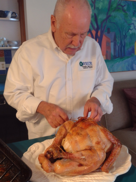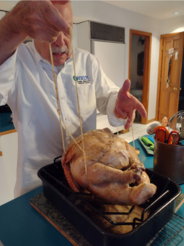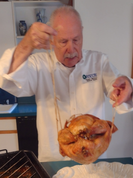 The string cradle makes lifting the finished bird out of the roasting pan, easy duty. Now let it rest, 30 minutes to an hour, while the other meal items are readied.
