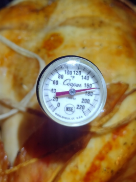 Looking for 165 degrees and it is there. Time to come out of the oven an let it rest. The bird came with a plastic popup temperature indicator but it is always best to check with a good thermometer. Test in the thickest part.